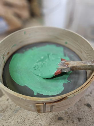 顔料は、混ぜれば混ぜるほど濁ってしまうので、出来るだけシンプルに配合したいのですが、どうしても若草色になってしまう。