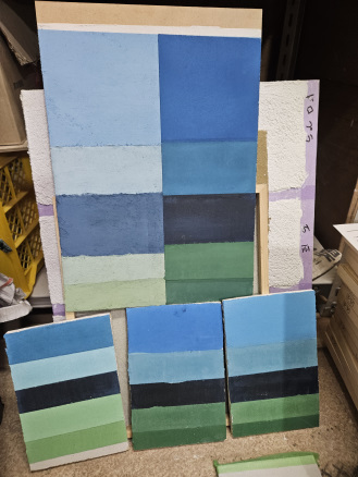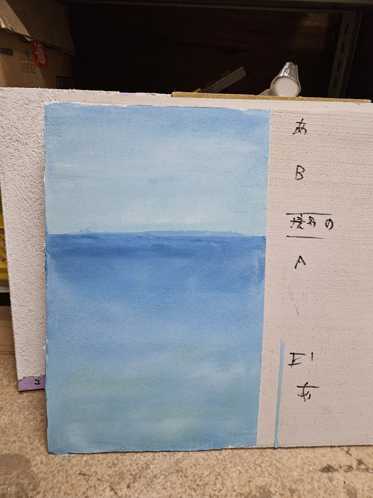 空や海に必要な、青・スカイブルー・藍・群青。ここら辺は比較的良く使う顔料で発色もできるので問題ないのですが、
