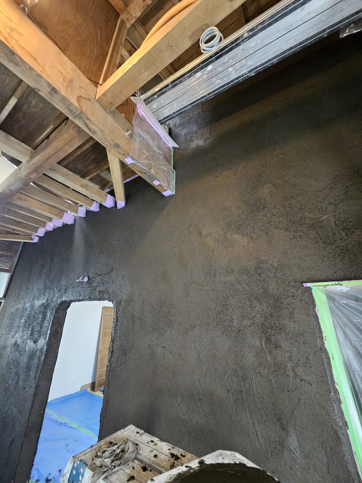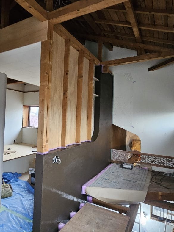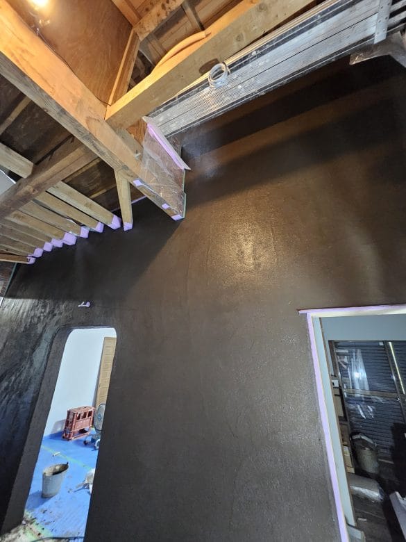 三浦市のリノベーション工事の現場にて、土壁の仕上げ塗が始まりました。