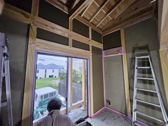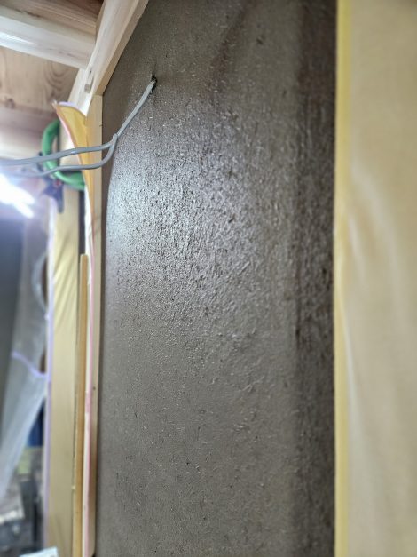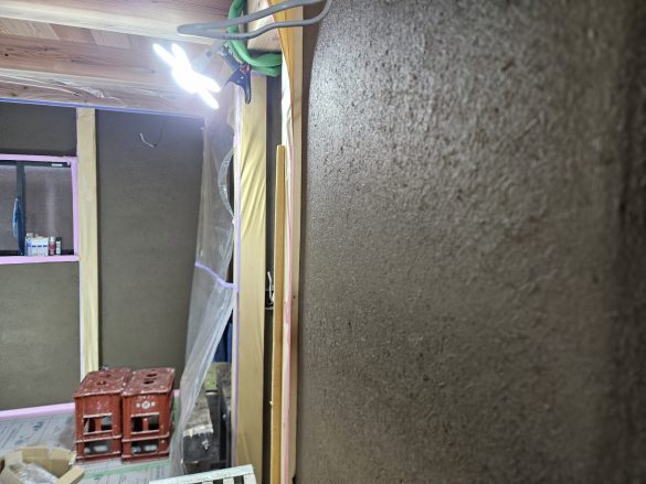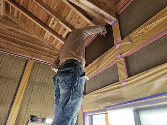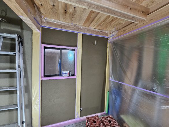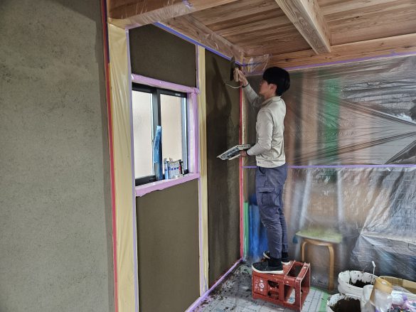 本日より土壁の最終工程、中塗り仕上げになります。