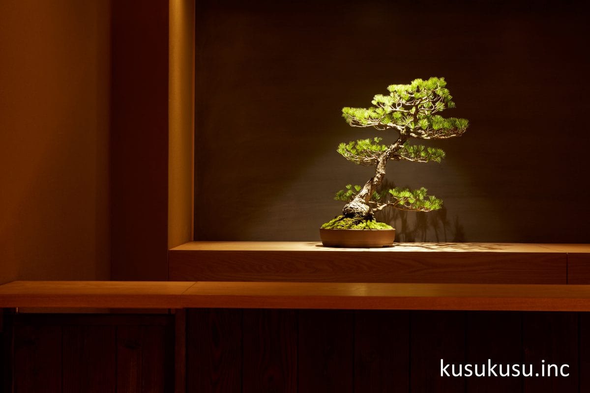 デザイン会社 kusukusuさんからのご依頼で、盆栽が中央に配置されるカフェという特徴と純和風の空間