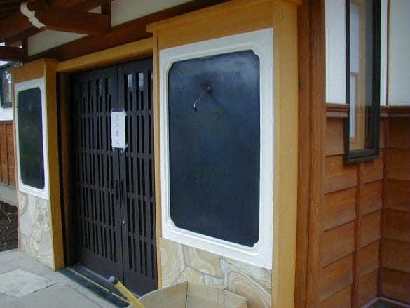 玄関鏡板を漆喰で仕上げました、縁取りの白い漆喰の中を黒漆喰の磨き仕上げ。幾度も鏝を当てて磨き上げる伝統的な仕上げになります。