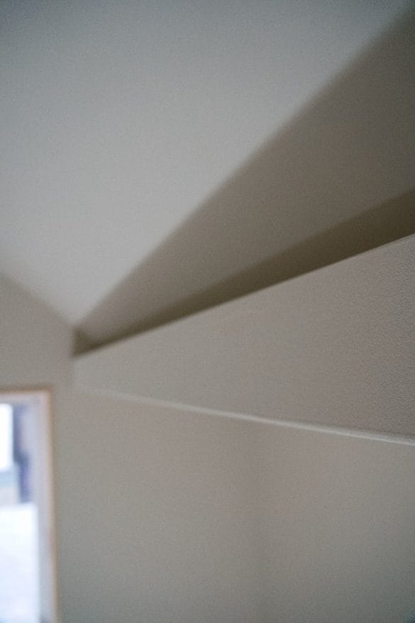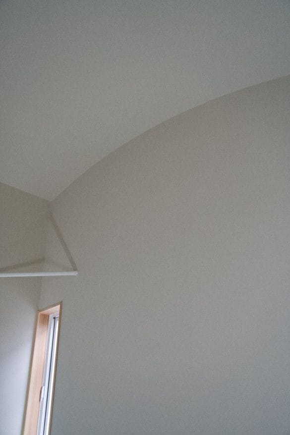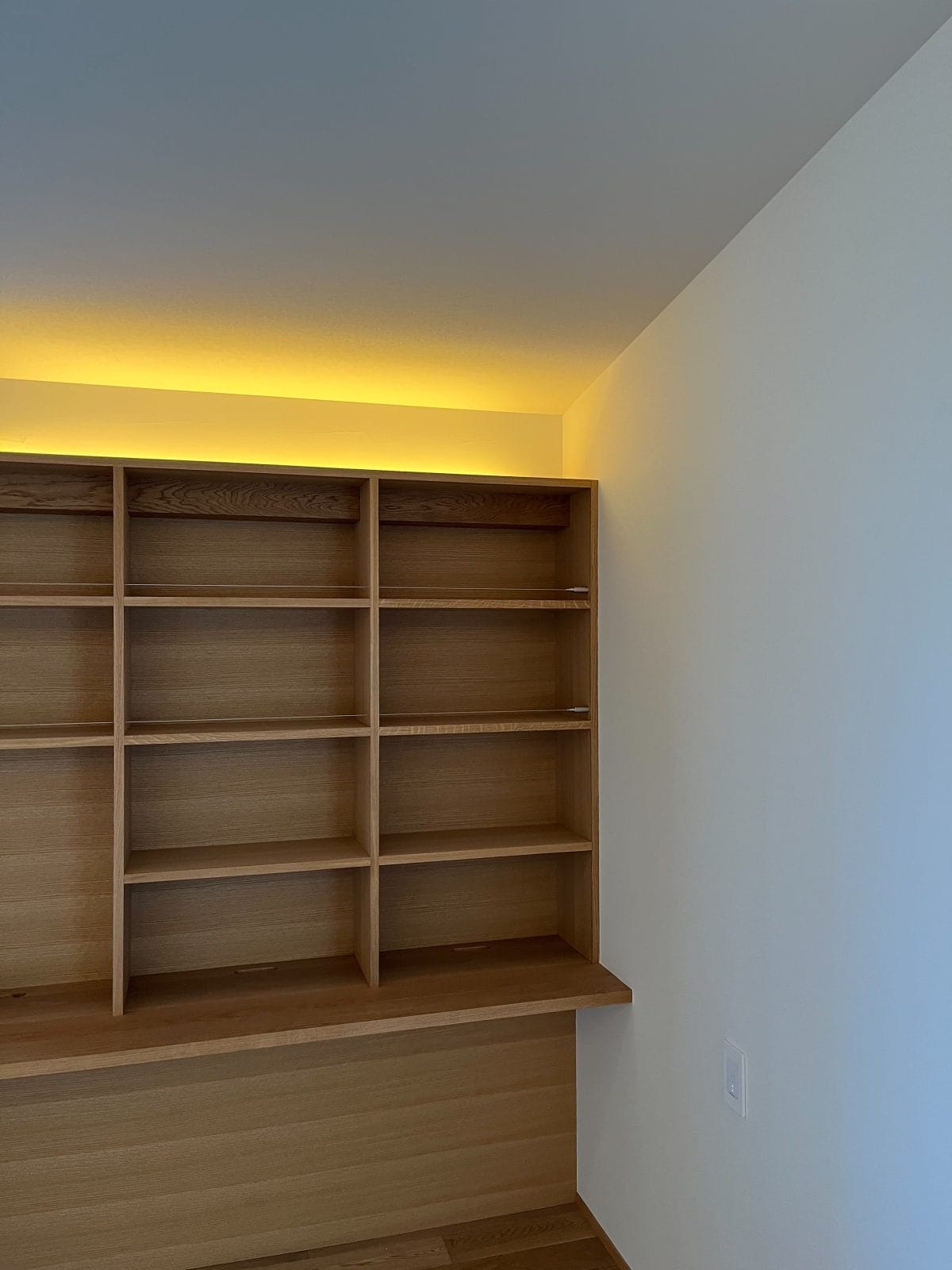 壁の角をR(アール)仕上げにすることで、直線的になりがちな新築空間に柔らかさと丸みを演出。どこかほっとするような、包まれる感覚の空間が完成しました。シンプルながらも、細部にこだわった上質な仕上がりです。