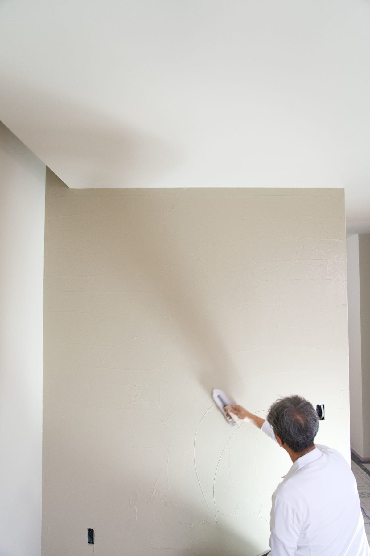 職人の手によって丁寧に仕上げられた、控えめで落ち着きのある鏝パターン。主張しすぎず、それでいて確かな存在感を持つ壁面が、シンプルな空間にやさしいリズムを生み出しています。