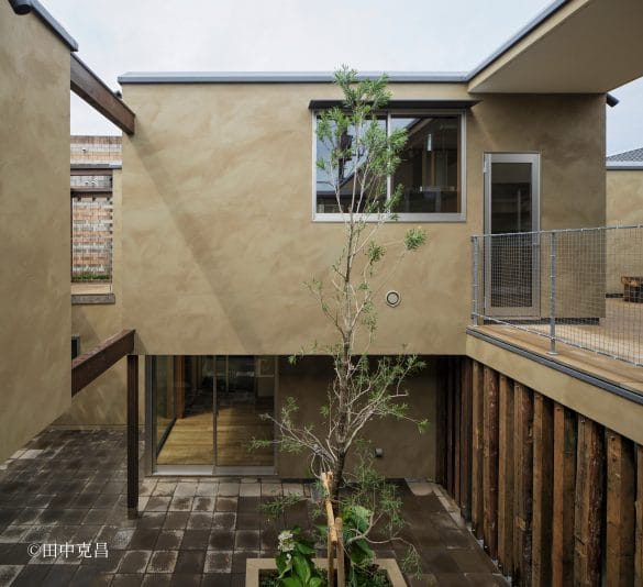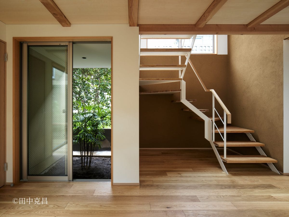 自然と家族に寄り添う二世帯住宅というコンセプトのもと、関東ロームの土をアップサイクルする技法として、